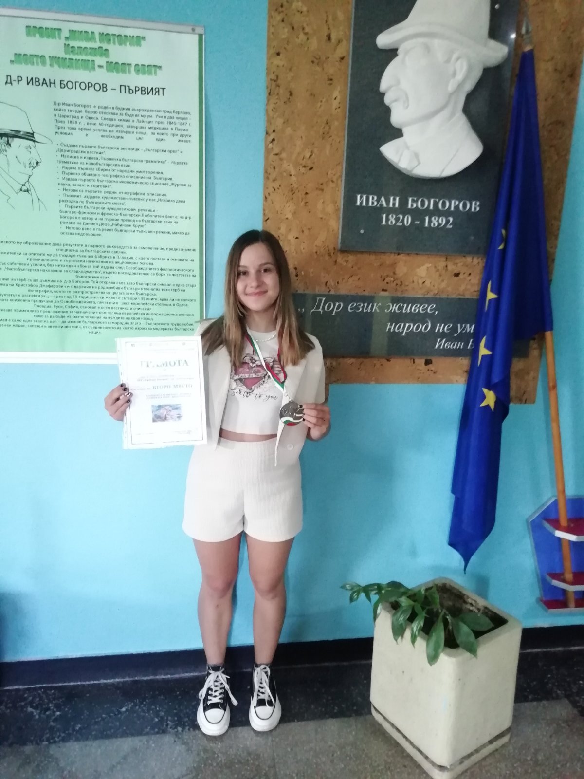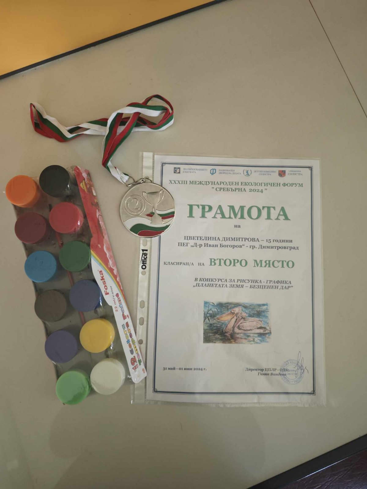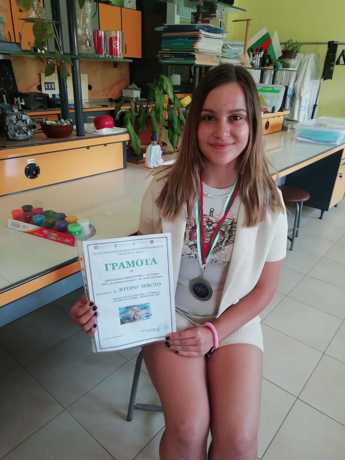 Цветелина Димитрова от IX-б клас участва успешно в XXXIII Международен екологичен форум „Сребърна 2024г“. Тя е класирана на престижното второ място в националния конкурс за рисунка или графика на тема „Планетата земя – безценен дар“.