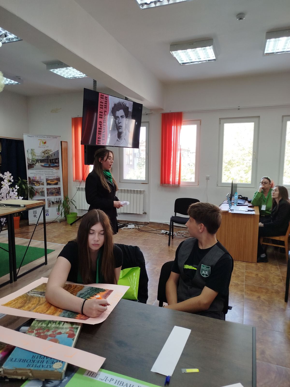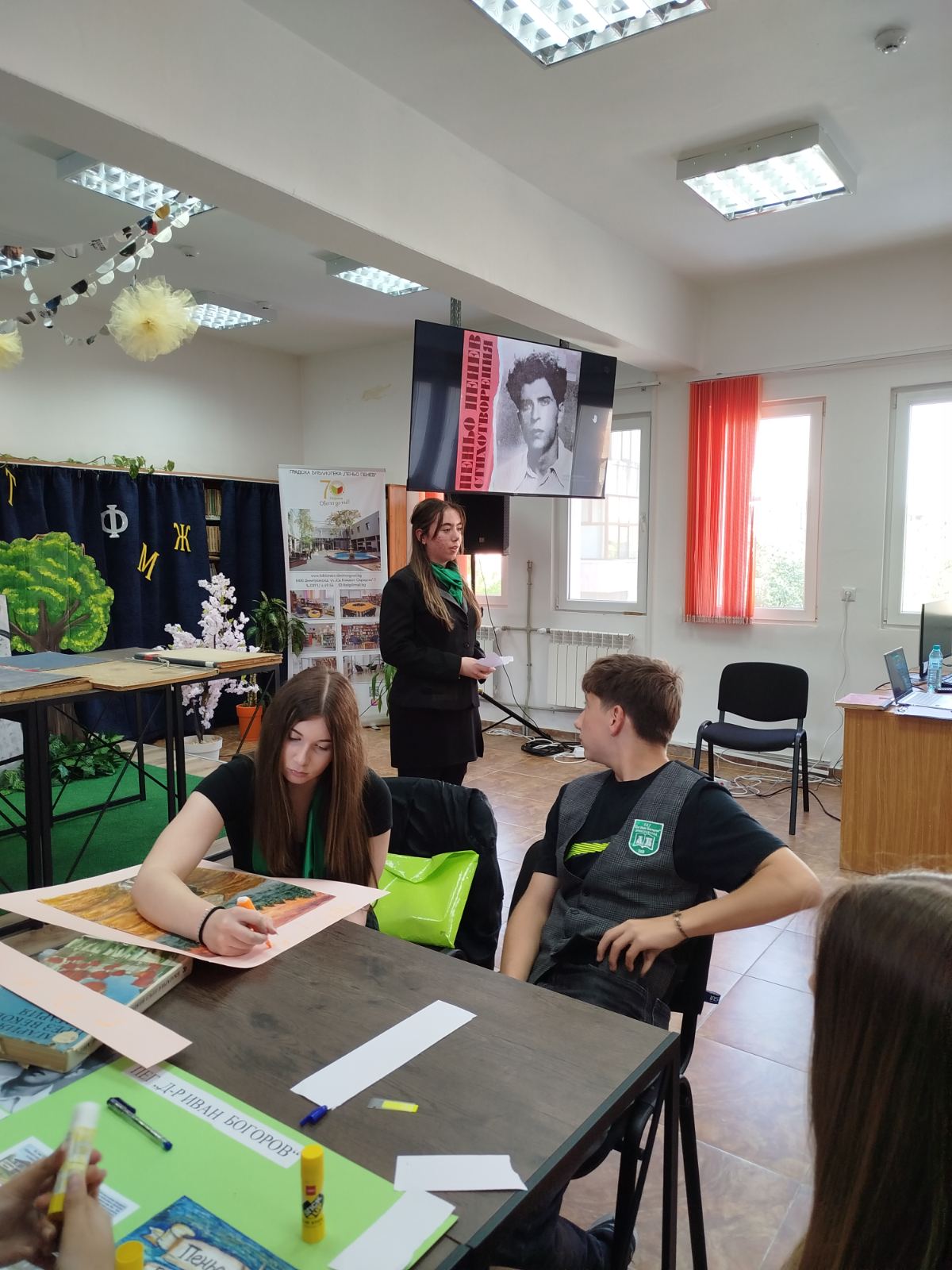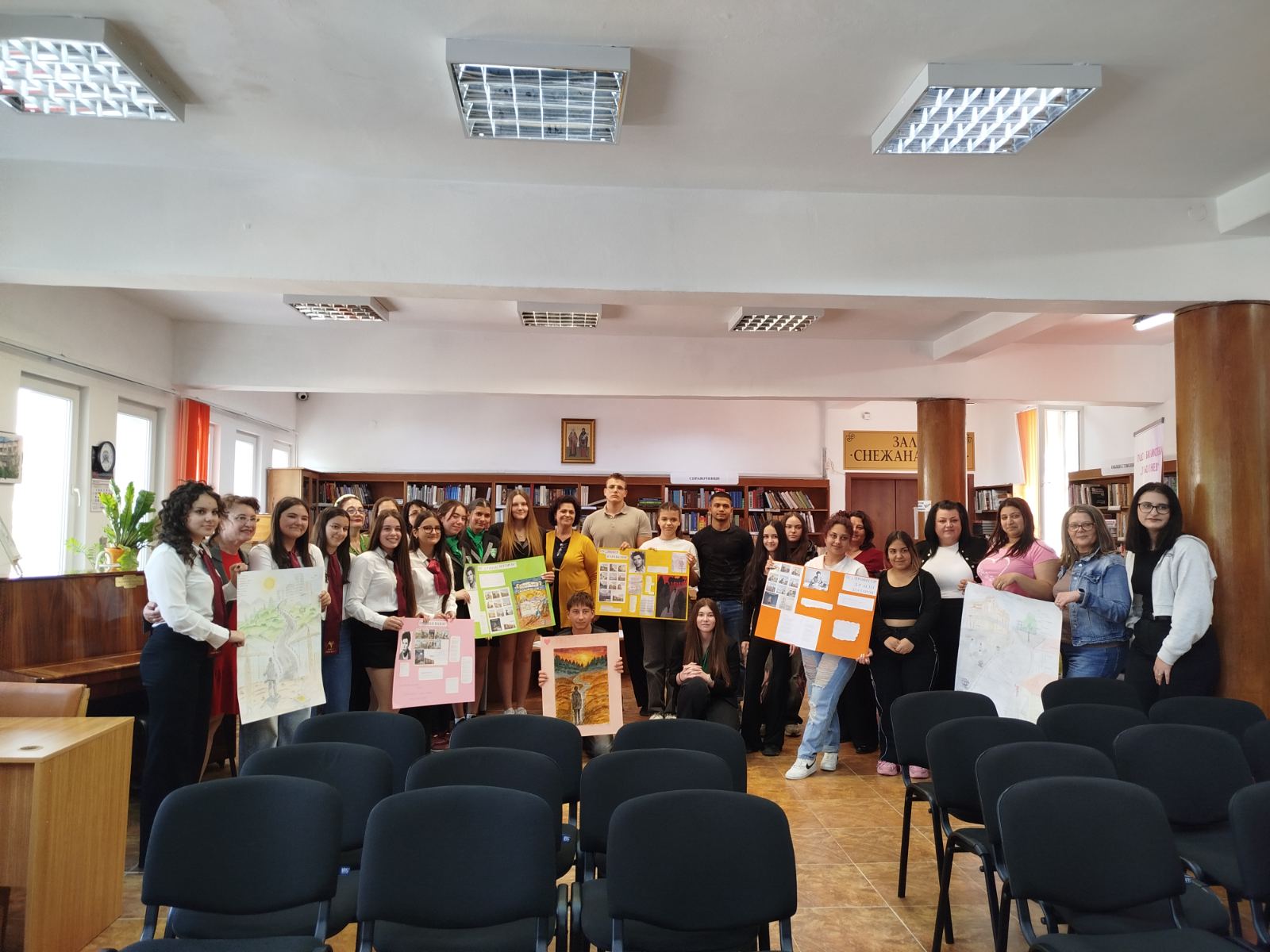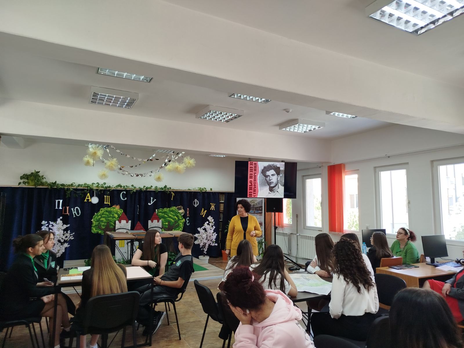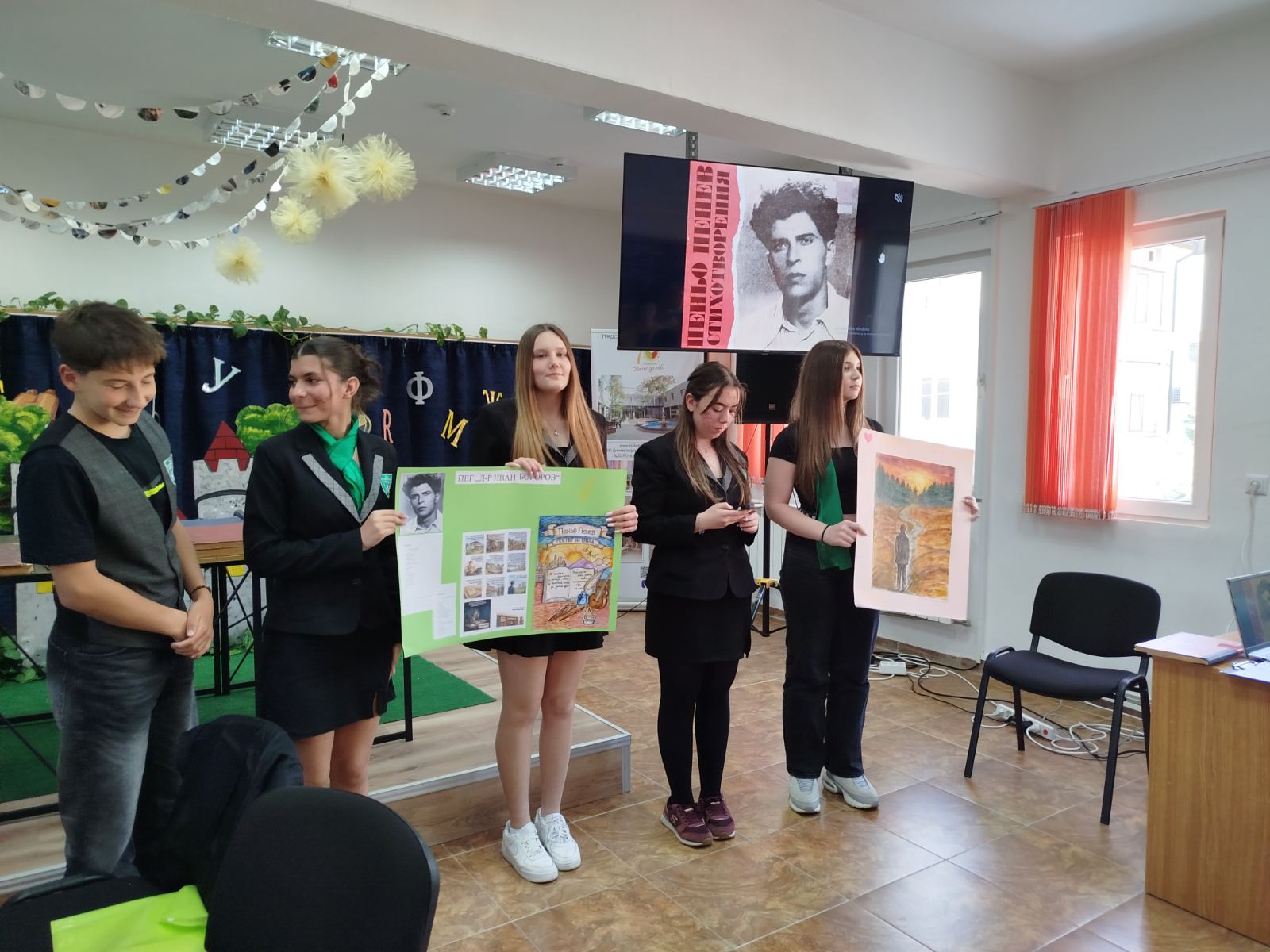 Днес /28.04.2026 г./ нашите прекрасни ученици от VIII А клас – Виктория Русева, Семелия Пеневска, Атанас Янков, Симона Дойчева и Никол Миткова, взеха участие в интерактивен урок свързан с живота и творчеството на Пеньо Пенев. Организатор на събитието е ГБ „Пеньо Пенев“. То е част от серия събития от Дните на поезията – 2026.