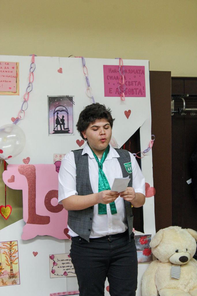 Събитието продължи със стихотворения за любовта на езиците, изучавани в гимназията. Ани Гочева, Ванеса Стоянова и Александър Христозов от 11. Клас изпълниха произведения на английски език. Дванадесетокласниците Христо Русев и Теодора Иванова представиха любовна лирика на испански език, а Магдалена Стоянова от 10. клас чете лирика на немски език. Любовната лирика на руски език беше представена от Кристиян, Диана и Татяна от 10. клас. Любовта прозвуча и на един от скандинавските езици благодарение на Далия Агелова от 10 кл, която представи любовни стихове на норвежки език.